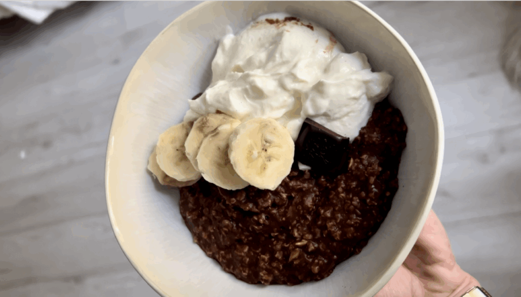 Czekoladowa owsianka na zimno z kakao, skyrem waniliowym, bananem i czekoladą